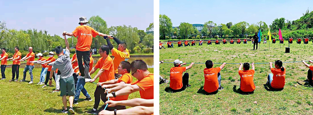 熱身完成之后,團(tuán)體游戲動(dòng)力轉(zhuǎn)圈也隨后而來(lái),我們手拉手圍成一個(gè)富有張力的圓環(huán),像極了我們?cè)诠ぷ髦袌F(tuán)隊(duì)中的共同平臺(tái),一個(gè)人的力量是渺小的,共同的力量是巨大的,六百個(gè)轉(zhuǎn)圈在大家高昂激情的口號(hào)中也輕松的完成了。之后教練加大了游戲的難度,由四隊(duì)各出一名成員站在麻繩上繞著走一圈,這極大的考驗(yàn)了團(tuán)隊(duì)協(xié)作的能力及互相之間的信任。選出的成員在上面走的同時(shí),下方的同事會(huì)鉚足了勁努力往后傾著身子,為了讓繩子緊實(shí)的同時(shí)更加穩(wěn)固,通過這個(gè)活動(dòng)讓我們明白了我們是一個(gè)團(tuán)隊(duì),是一個(gè)值得彼此信賴的團(tuán)體。
