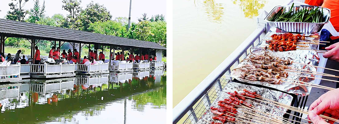 動(dòng)力圈結(jié)束后就到了中午的燒烤時(shí)間,我們從草坪出發(fā)沿著營(yíng)地湖邊走到了湖上的水上長(zhǎng)廊,坐在涼風(fēng)習(xí)習(xí)的水中亭廊上,各式各樣的燒烤食材齊齊擺上,公司里一個(gè)個(gè)隱藏的燒烤老師傅開始大顯身手,金黃的雞翅,油滋滋的五花肉,香噴噴的魷魚等一一出爐。同事們悠閑的坐在椅子上,吹著微風(fēng),吃著美味的食物,喝著爽口的飲料和酒,還有同事自制了工具用著烤好的食物去勾著湖里的小蝦。